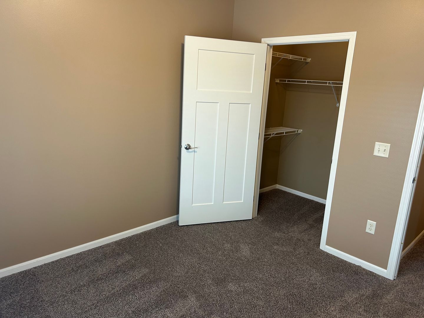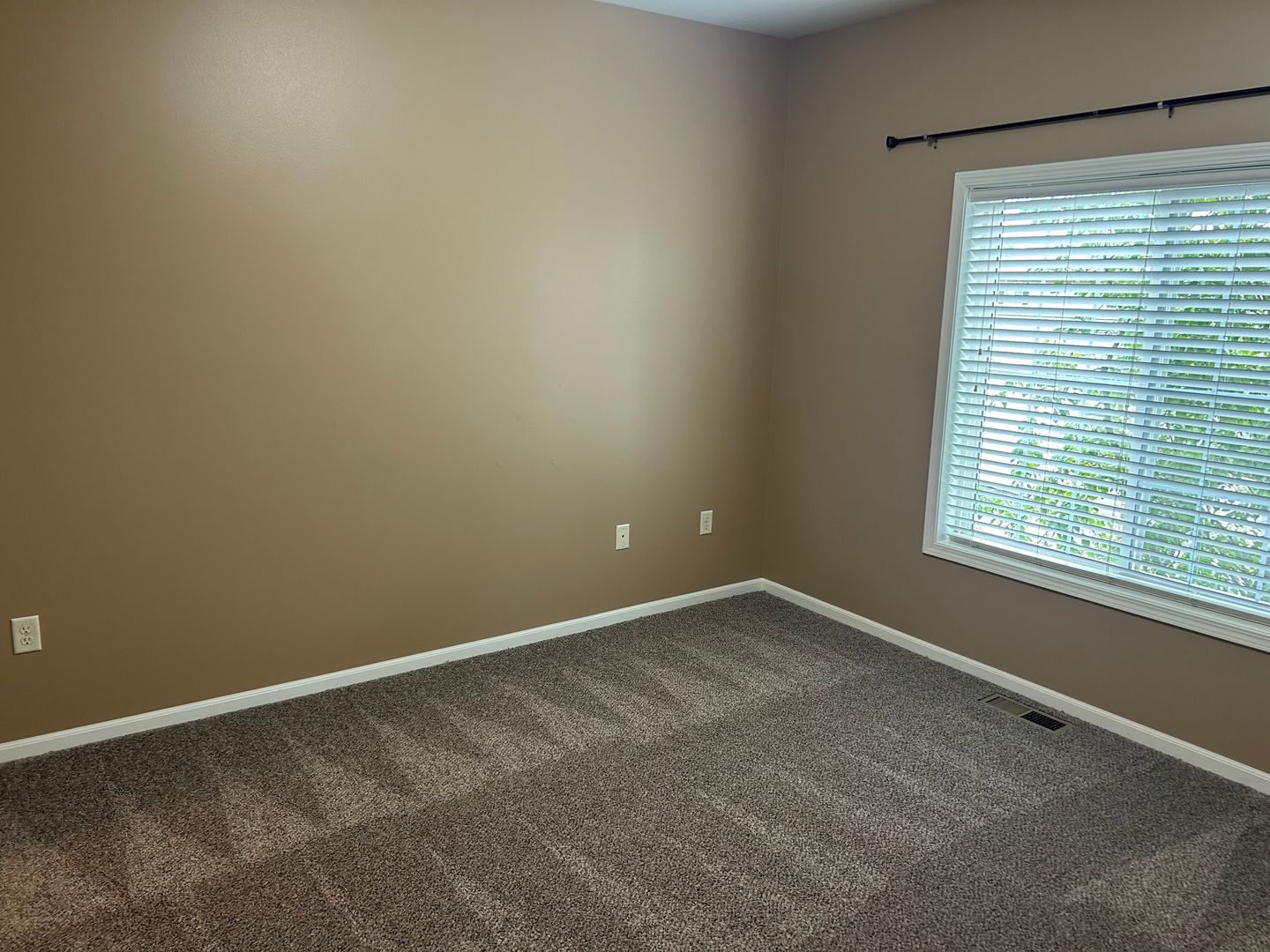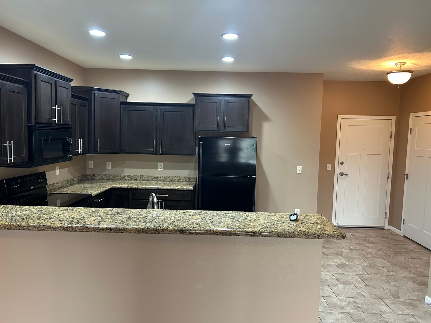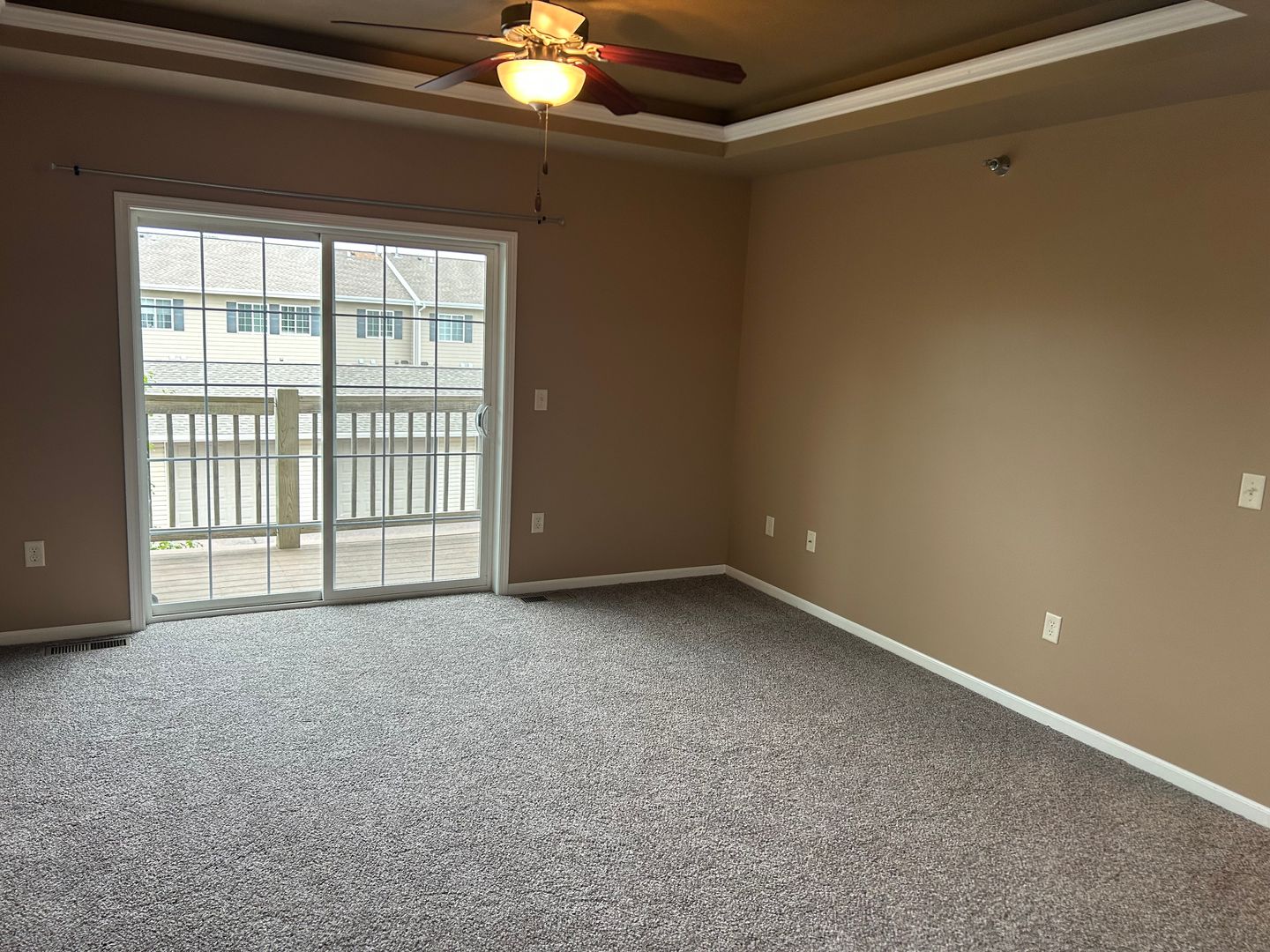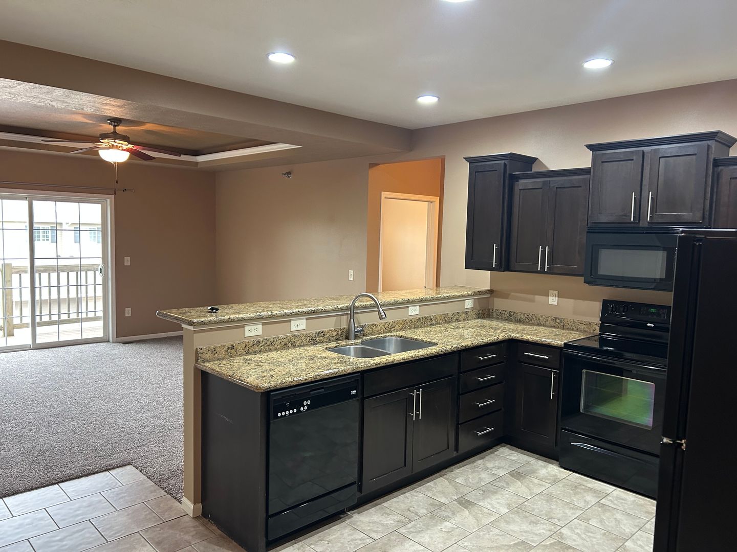 This beautifully updated 2-bedroom, 2-bath condo at Heartland Fields offers an open-concept layout with tray ceilings, a spacious living area, and a walk-out balcony. The kitchen features dark wood cabinets, granite countertops, black appliances, and a large eat-in peninsula. With brand-new carpet, fresh paint, a primary suite with a walk-in closet, and a separate laundry room with extra storage, this home is move-in ready. A single-car garage is included, with water, garbage, lawn, and snow care covered in rent.