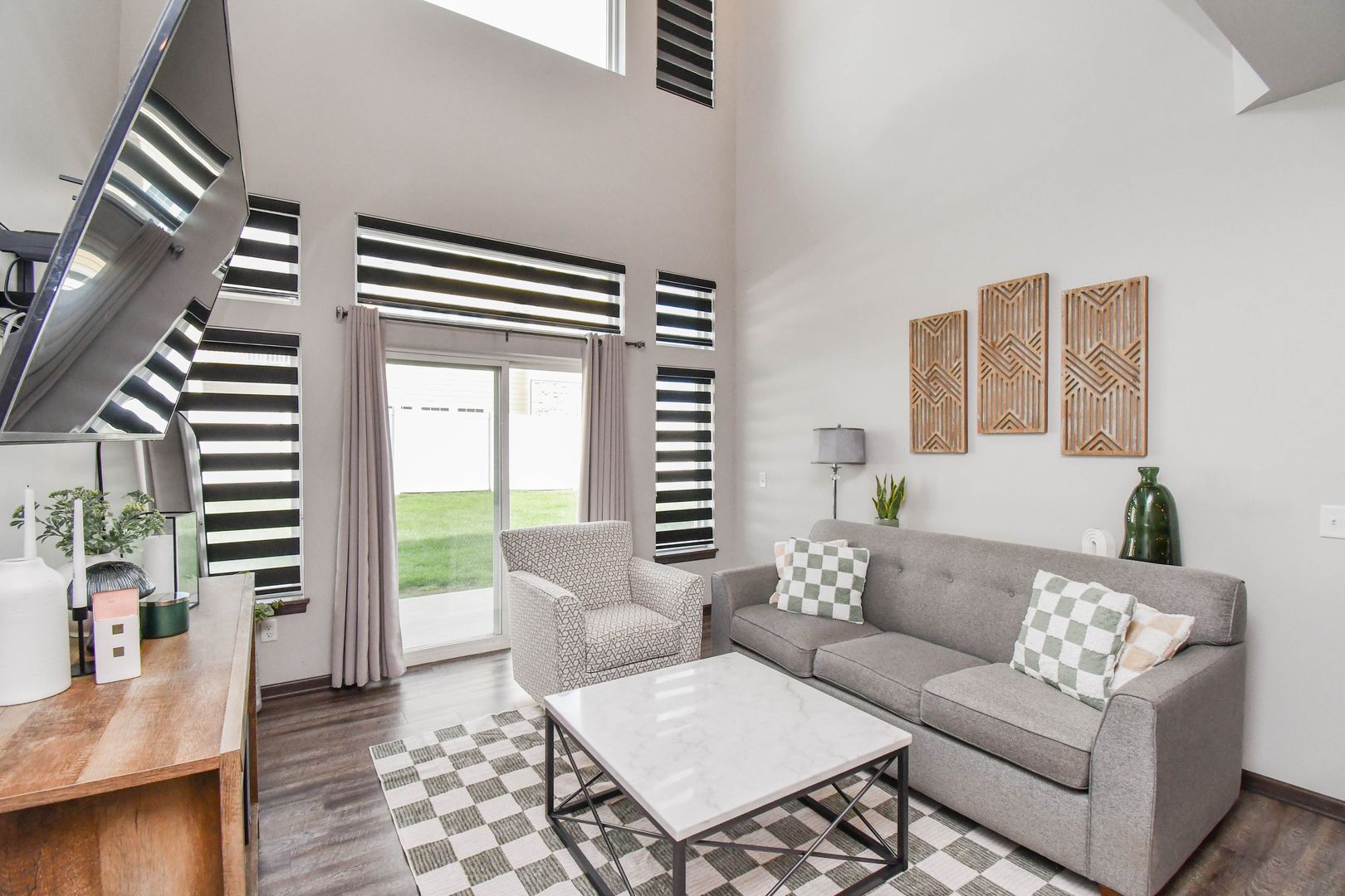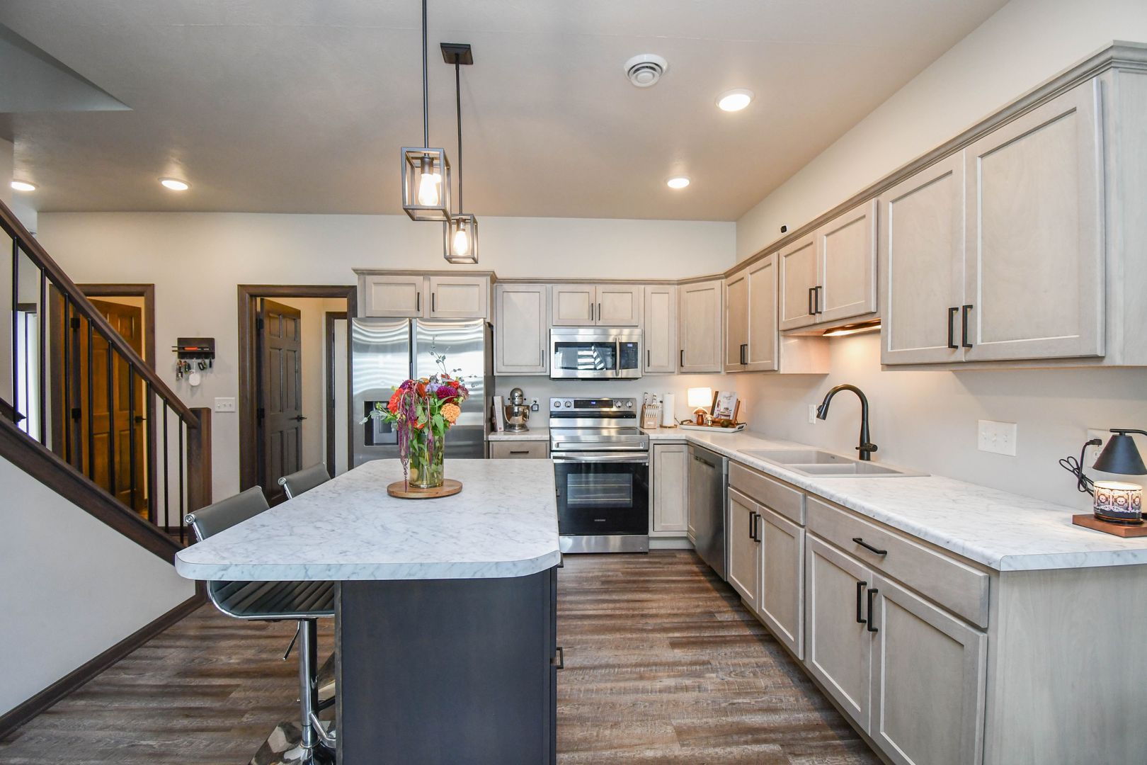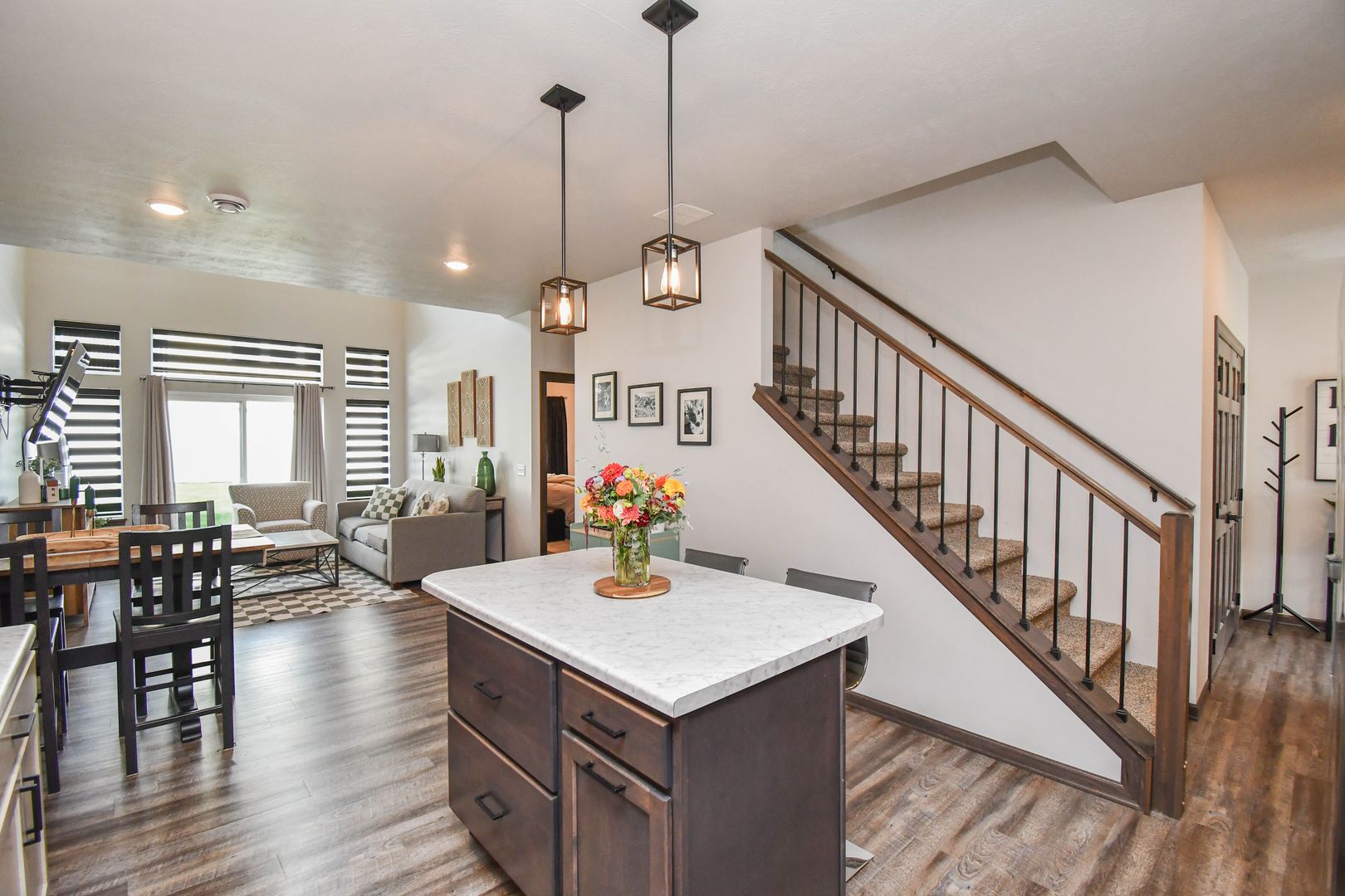 Enjoy easy living in this beautifully maintained home where snow removal and lawn care are included. The main level features an open living room filled with natural light, a modern kitchen with newer appliances, and an island with an eating bar. The master suite on the main level offers a walk-in bathroom and walk-in closet for added convenience. Upstairs, you’ll find an extra family room and two additional bedrooms, perfect for guests or flexible living space. A two-car garage completes this comfortable and convenient home.