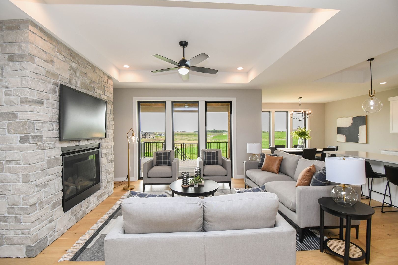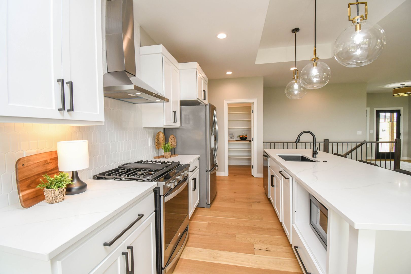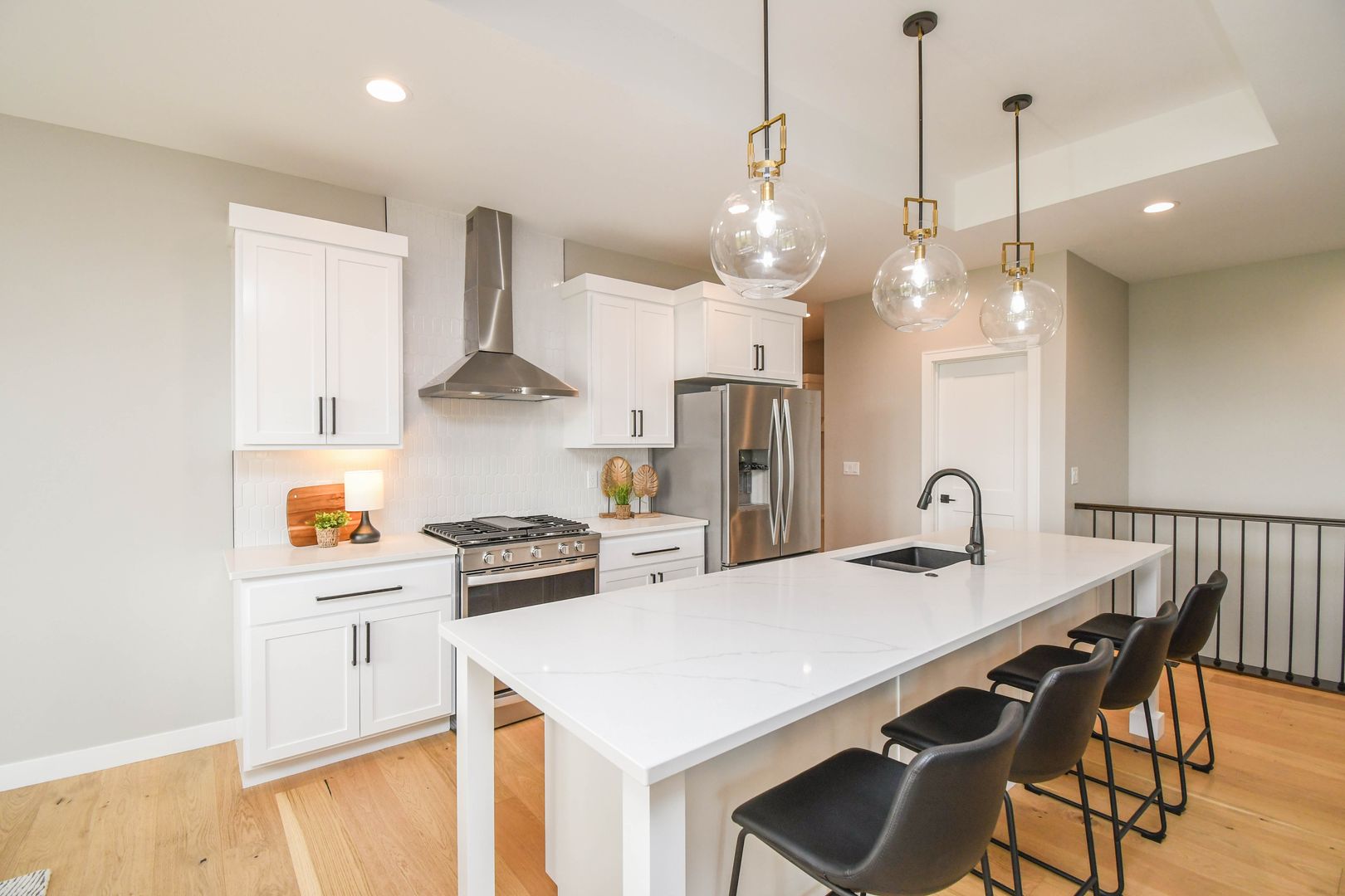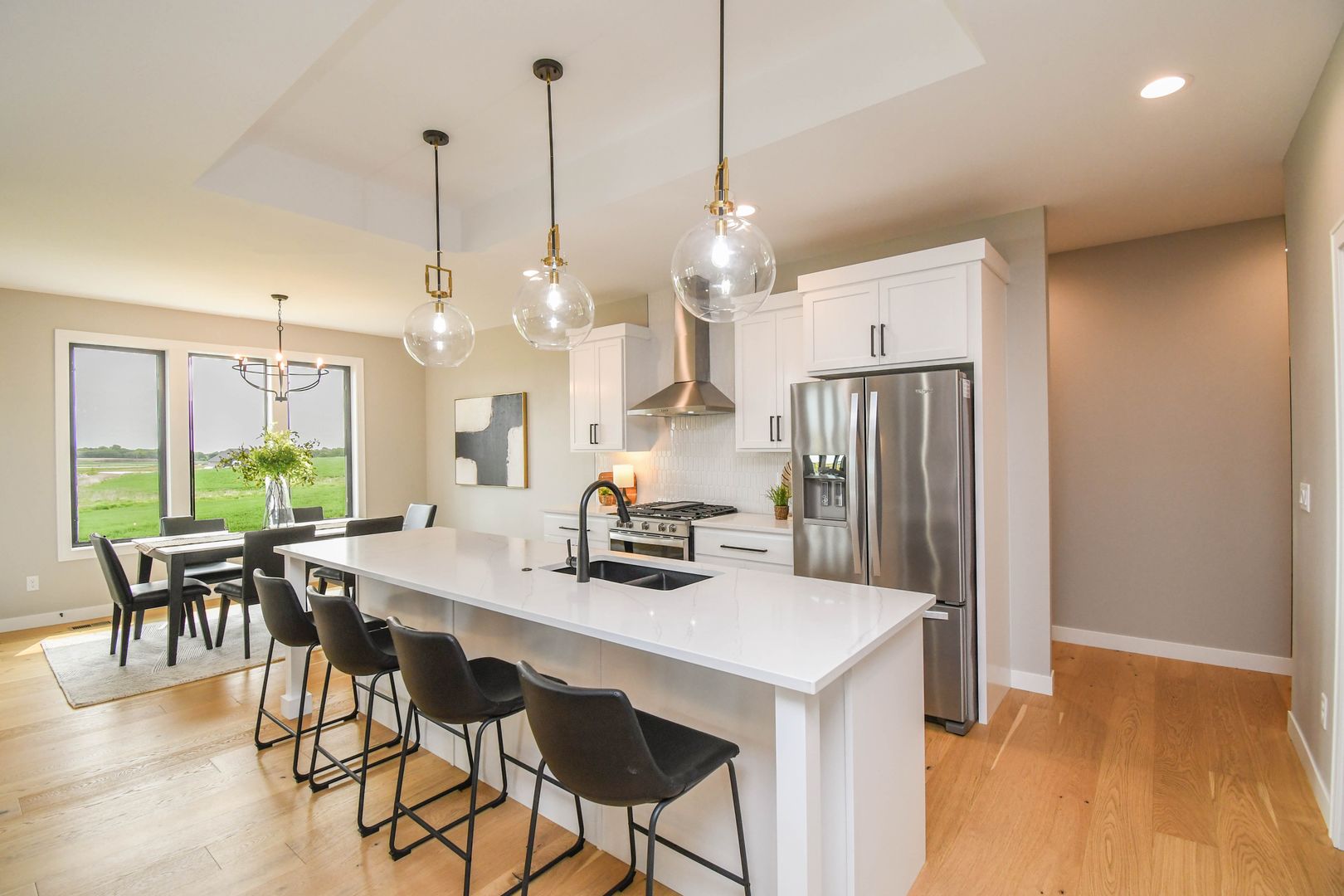 Spacious and stylish ranch walkout home featuring 5 bedrooms and an open-concept layout perfect for everyday living and entertaining. Enjoy warm wood floors, a bright living room with large windows, and a gas fireplace. The kitchen offers quartz countertops, stainless steel appliances, and a walk-in pantry, while the walkout lower level includes a wet bar and extra living space. A heated three-stall garage with floor drains adds year-round convenience, all on a private lot with no backyard neighbors.